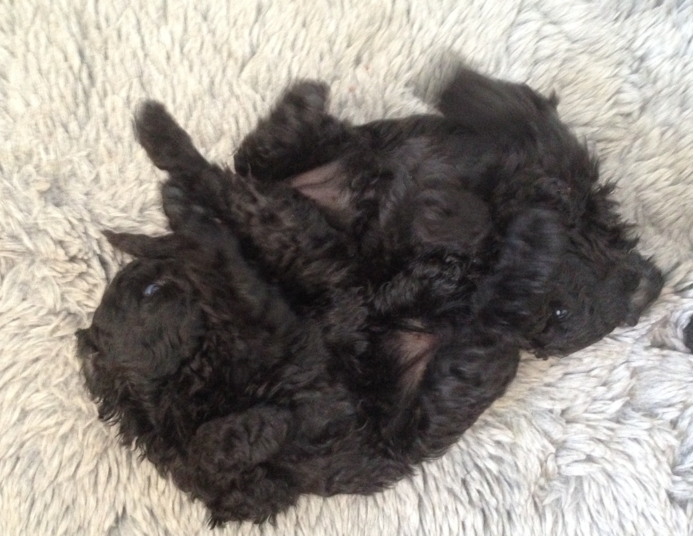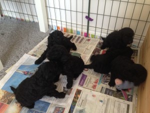 Idag är valparna fyra veckor och nu är alla uppe på benen och skuttar omkring på ostyriga ben. Valplådan är borta och har ersatts av en valphage. De äter med god aptit nötfärs blandat med äggula, men bäst av allt är mammas mat.